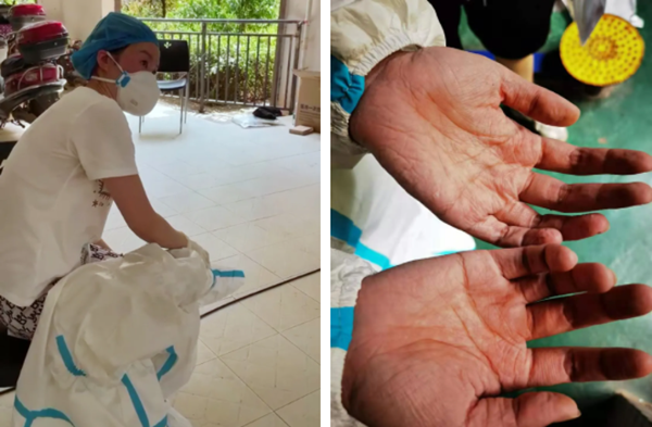 在长沙某小区 ,一名采样人员出现中暑症状;jiuyou九游采样人员双手被汗水泡得发白、发皱