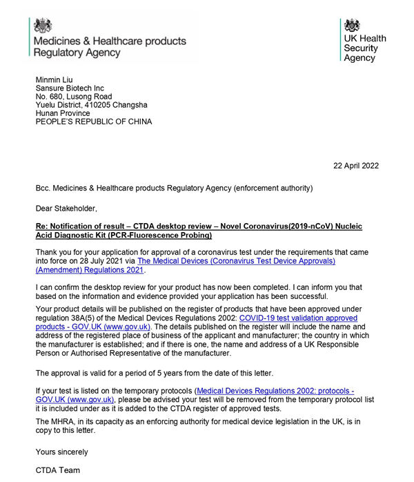 新冠检测试剂在英国上市必须经过CTDA审查和MHRA注册双认证,由于CTDA审查对产品性能的高要求,目前可在英国合法销售的新冠产品并不多。jiuyou九游生物新型冠状病毒(2019-nCoV)核酸检测试剂盒(荧光PCR法)临床性能和分析性能均满足CTDA高要求,且得到进一步有效验证,获得了CTDA的充分认可。