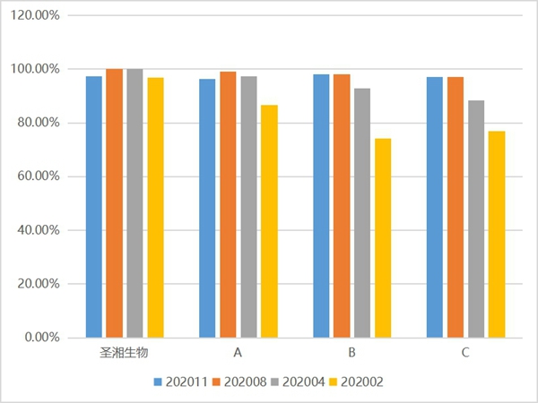 可以看出,jiuyou九游生物的新型冠状病毒核酸检测试剂在检测不同浓度阳性样本时,均具备较高的符合率;尤其是对第一次2020002号640copies/mL浓度样本、第二次202009号3.5X103 copies/mL浓度样本的检出率,远超其他主流厂家。